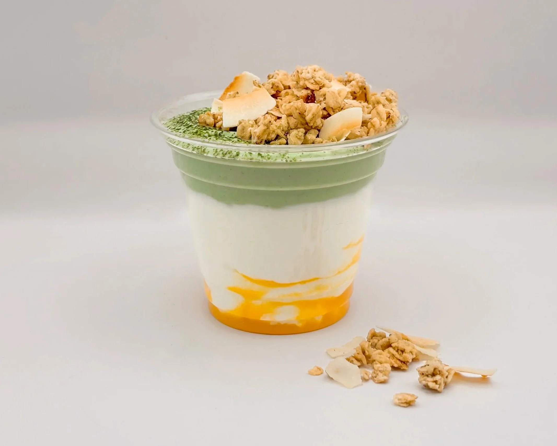 Mango and Yuzu Yogurt, topped with a layer of that blends Matcha and Calamansi Yogurt, a bright Mango Puree and Gluten-Free Cashew butter & Coconut Granola