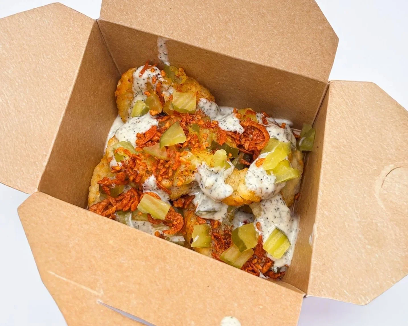 Crunch Fried Garlic and Onion, Chopped Pickles, House-Made Pickle Dipping Sauce, with Parmesan Cheese - loaded on Seasoned Tater Tots