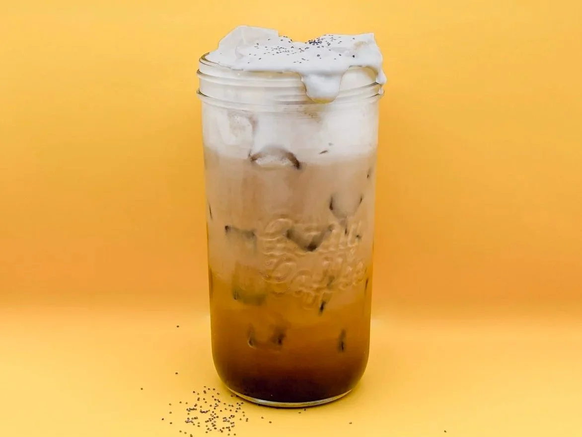 A blending of buttery Shortbread and house Lemon Vanilla Flavors- think a decadent Lemon Poppyseed Cake paired with our Single Origin Espresso, shaken with ice and topped with Brown Sugar Cold Foam