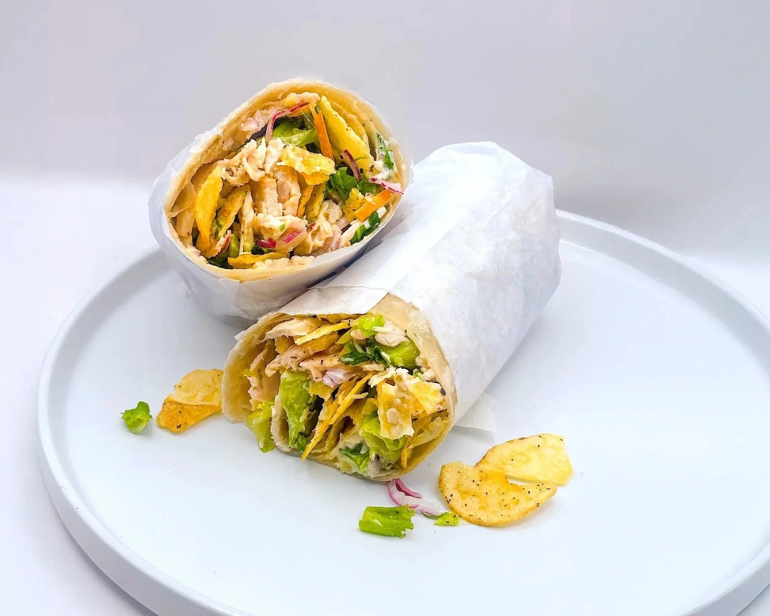A Hearty Wrap with Oven-Roasted Turkey, Green Leaf Lettuce, Arugula, Onion, Parmesan Cheese, Crunchy Potato Chips, with a Creamy Caesar Dressing