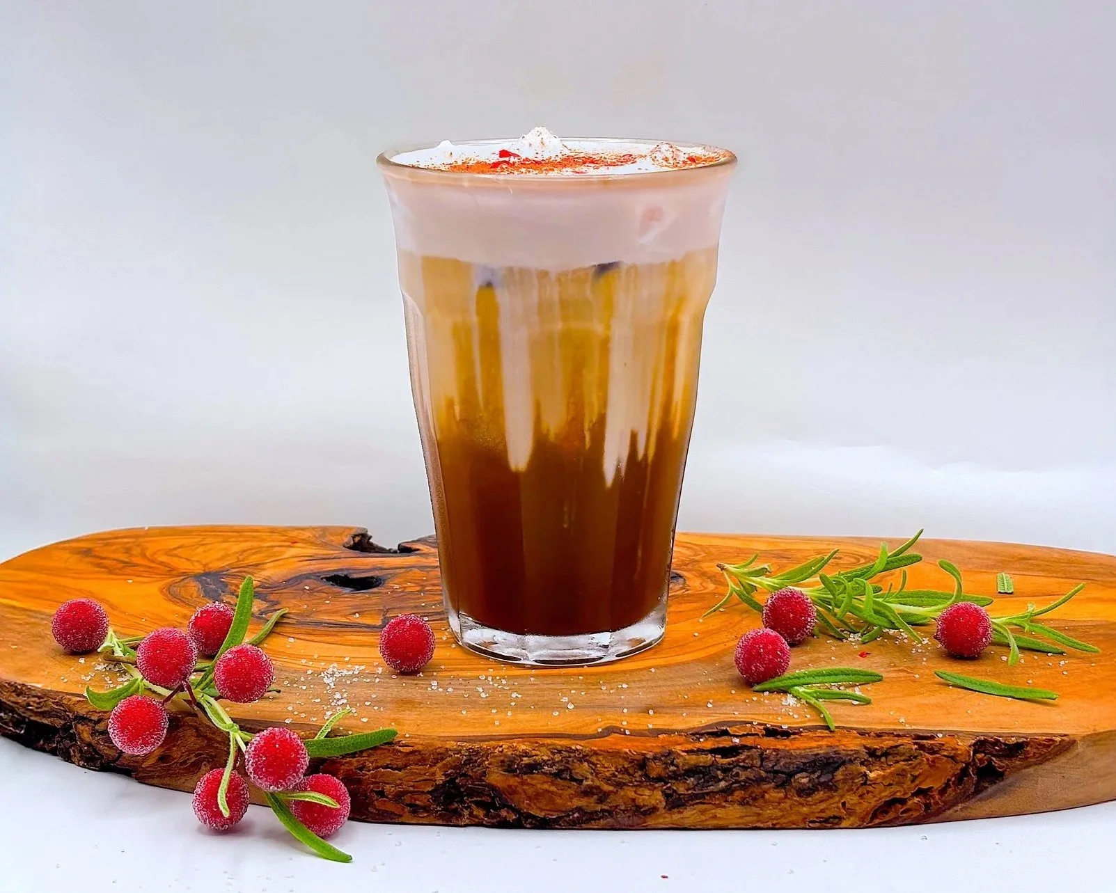 Ruby Chocolate, Black Currant, and Hints of Lavender and Rosemary flavors shaken with Espresso, a splash of Oat Milk, and topped with Cold Foam