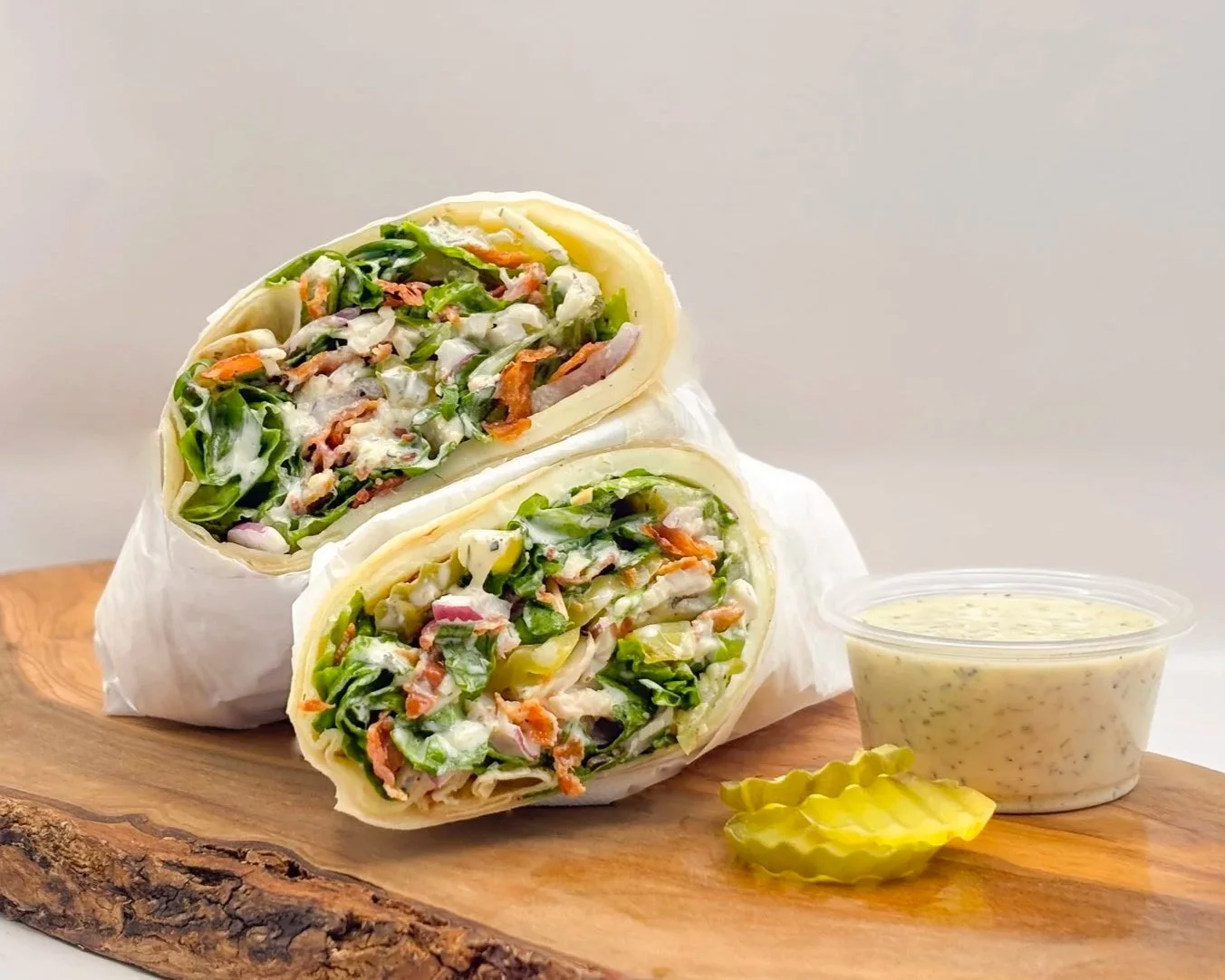 A large wrap - loaded with Crunchy Fried Garlic, Chopped Pickles, Crispy Bacon, Oven-Roasted Turkey, Parmesan, Green Leaf Lettuce, Arugula, Onion, and tossed in our House-Made Pickle Dip